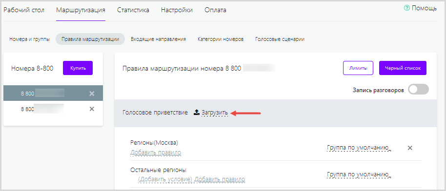 Настройка голосовых приветствий доступна в тестовом тарифном плане.