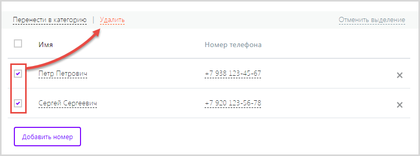 Чтобы удалить сразу несколько номеров, выделите их в списке и нажмите «Удалить» над таблицей. Подтвердите удаление.