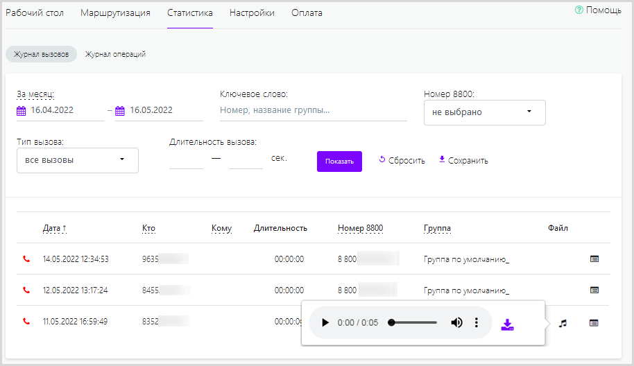 В разделе «Журнал вызовов» отображается список всех успешных и неуспешных входящих вызовов на номера 8-800, приобретенные в данной учетной записи.